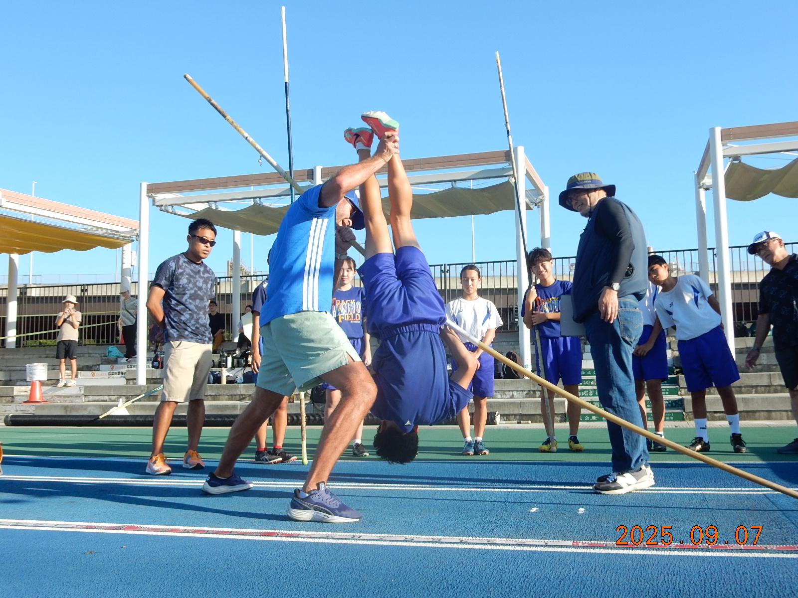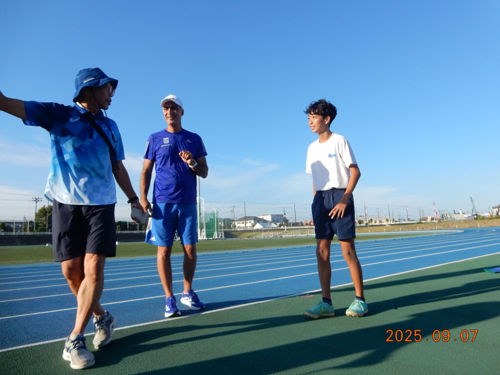 9月7日(日)16:00から東京世界陸上に出場するギリシャ陸上競技選手団のコーチから直接中学生が学ぶ機会を設けていただきました。短距離、走幅跳、棒高跳の3つの種目で参加した中学生は、目をキラキラさせながらコーチのアドバイスを通訳さんを通じて聞いての活動でした。1時間でしたが、一生の経験になったことと思います。
